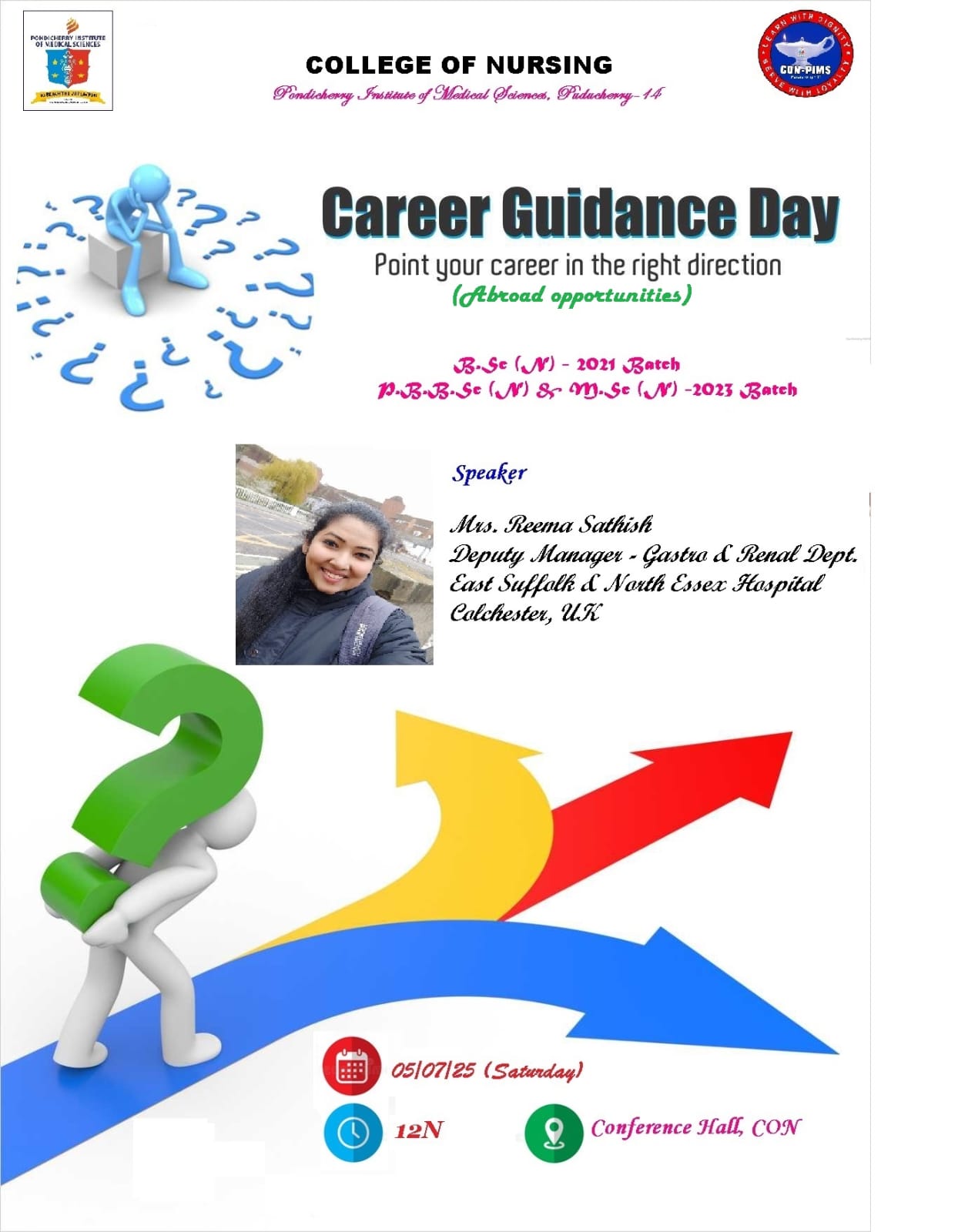 The Career Guidance Program at College of Nursing, P.I.M.S. offers support for students for their professional journey in the nursing field. Through a series of seminars, guest lectures, and information sessions, students learn about many nursing career options, including areas of specialization and employment opportunities in India and Abroad. Through networking events, students can establish important connections with nursing industry experts and alumni, which may lead to future employment opportunities.